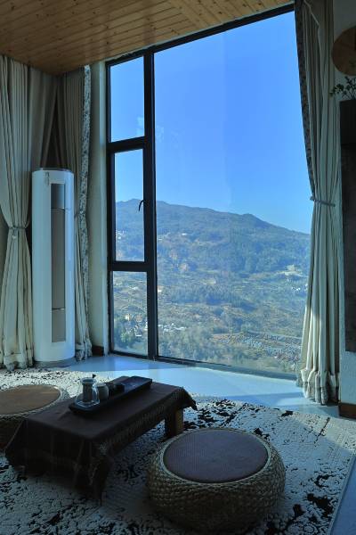 房间落地玻璃,拉开窗帘见梯田