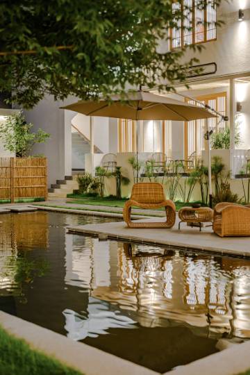 享绿植环绕庭院,观锦鲤鱼池